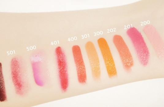 400是這次的主打色,401是稍微濕潤一點的質地,單擦一層是半霧半透的質感,塗厚一點則可呈現如漆光唇釉的感覺。500和501則是透潤的水光的質地,不要看它水水透透的,擦上後的唇色超好看!600就回歸到絲絨感,顯色度很好。