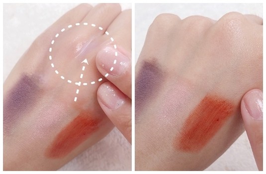 在手上塗擦防水型彩妝及持久型唇彩,使用卸妝油卸除看看,不用大力搓揉彩妝就瞬間溶解~