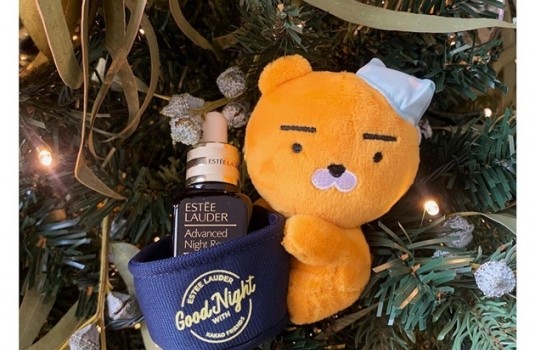 Ryan娃娃頭戴睡帽,抱著寫有Good Night With KAKAO FRIENDS,呼應著雅詩蘭黛小棕瓶「夜間修護」的特點,設計超有心~