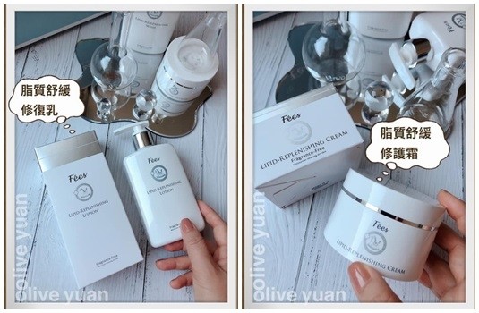 而「脂質舒緩修復乳」及「脂質舒緩修復霜」可以擇一使用或重疊加強使用,基本上我一定是用「霜」,因為「Fées」的「霜」看起來滋潤但卻非常好吸收,我覺得對乾性及敏感性肌膚來說保護力更強!一般肌膚就選修復乳。