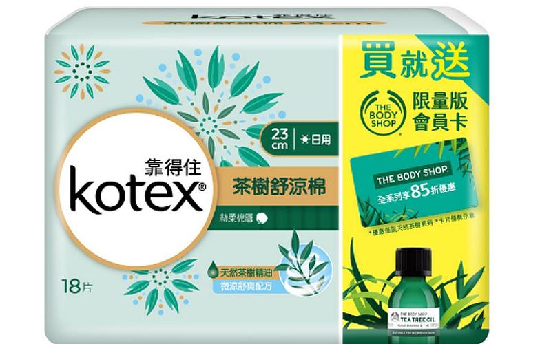 夏日腳步接近,國內女性衛生棉領導品牌Kotex靠得住近日與以茶樹系列保養品聞名的The Body Shop美體小舖跨界攜手推出聯名促銷活動,即日起至四月底或五月中,凡於全聯、屈臣氏、康是美、寶雅、家樂福、大潤發、愛買等通路,購買Kotex茶樹舒涼棉組包商品或購買金額滿NT$188(*詳細活動內容請見文末),即可獲贈美體小舖期間限定白金會員卡,9月底前凡憑卡購買美體小舖茶樹全系列皆可享85折優惠(會員卡數量有限,送完為止)。