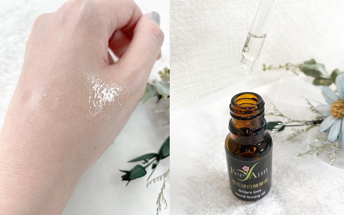 「FeeAnn橙花淨白精華油」除了以優雅的橙花為基底,還加入了能調理油脂分泌的苦橙葉、幫助油水平衡的佛手柑、以及滋潤修護的乳香等…能溫柔呵護肌膚的精油。質地輕盈柔潤,能迅速地被肌膚吸收,肌膚被滋潤的同時卻不顯油膩!更蘊含多種植物精油複方,四種天然植物油:玫瑰果油、琉璃苣油、荷荷巴油、摩洛哥堅果油,讓肌膚維持彈性與嫩白。