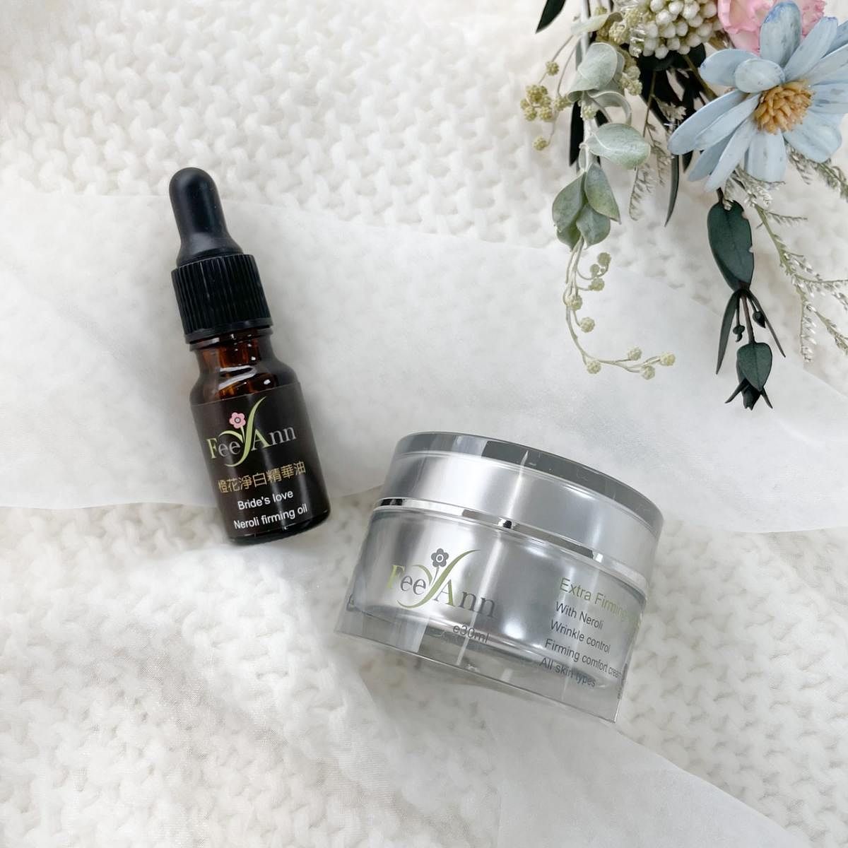 這兩款FeeAnn的明星商品除了可以單獨使用,還有個「1+1」的極致保養法,被稱為『女神的秘密組合』,將橙花淨白精華油滴入橙花全能乳霜中混合使用!換季時,肌膚狀況變得不穩定,一邊冒大痘,雙頰又乾燥脫皮,這種惱人的情形就快用「1+1」的方式來呵護不聽話的肌膚。清潔肌膚過後,完成了上化妝水與精華液的步驟,取出約1元硬幣大小的乳霜,滴上2滴精華油於其中,運用手的溫度讓乳霜與精華油融合在一起,再以手掌依序按壓覆蓋額頭、雙頰、鼻子與下巴,藉由掌心輕柔的按摩,讓精油的滋潤完全導入肌膚,保養度與療癒度加倍升級,真的是對肌膚寵愛又呵護!