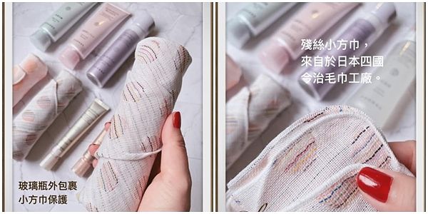 我更愛保護玻璃瓶身使用的小方巾,為了從總公司發送到各地時能安全抵達,與其使用馬上會被丟棄的泡泡紙包材,不如讓這些包裝能夠再利用,包裝在玻璃瓶外的「殘絲小方巾」,來自日本四國今治毛巾工廠的零星線頭,抱持不浪費的精神,這些零星線頭就成為了一條一條多彩的小方巾,而且吸水力好,我都隨身攜帶!