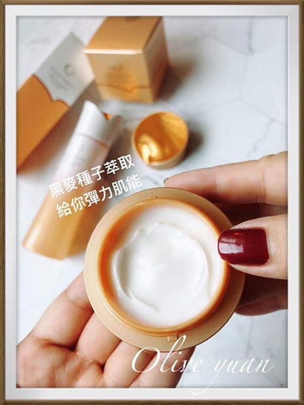另外乳霜的部分,我入手的是抗老系列的金罐—「盈潤緊緻煥肌霜」(台灣目前尚未販售),成分中一樣有添加「三重保水鏈」,還有讓肌膚發揮彈力肌能的「黑麥籽萃取」,加上「芍藥萃取、越莓葉萃取」等14種高保濕成分,然後香味是一系列的。