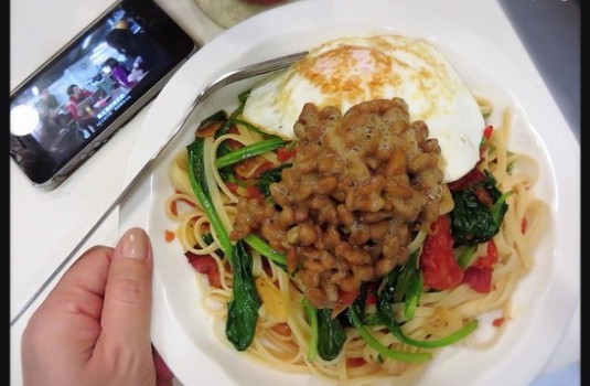【納豆荷包蛋菠菜培根蕃茄義大利麵】