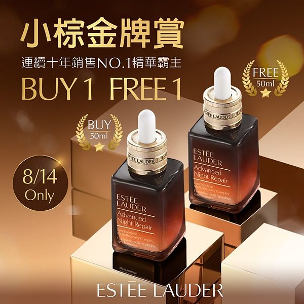 雅詩蘭黛力邀小棕鐵粉以及想體驗小棕瓶的新朋友,一同歡慶小棕瓶當之無愧的10年NO.1精華金牌認證,將於官網與全台櫃點,8/14(六) 0:00一日限定重磅推出【小棕金牌回饋組】BUY 1 FREE 1買50ML送正貨50ML,揪各位見證體驗全世界最厲害的小棕瓶超狂修護力!同場加映推出當日百貨專櫃獨享滿額NT$7,200,即贈明星三件組合,包含小棕瓶7ML+原生露15ML+小棕眼霜5ML,全方位呵護好肌膚,創造肌膚彈潤亮,拯救眼周疲累,僅此一天!要搶要快!