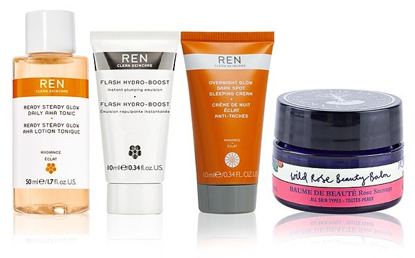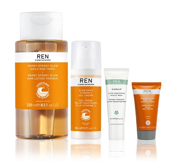 臉部保養組合 : REN 鮮果C 亮采煥顏化妝水 50ml、REN 鮮果C 亮采水凝晚霜 10ml、REN 即效水活彈潤凝乳 10ml、NYR 野玫瑰亮采萬用霜 15g