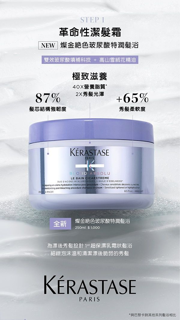 KÉRASTASE巴黎卡詩第1款超保濕乳霜狀髮浴,適用於漂後想提升保濕與修護力的脆弱受損髮。雙效玻尿酸填補科技修復漂染後秀髮空洞;高山雪絨花精油能提升秀髮防禦力、預防外在環境侵害。每日使用為秀髮帶來卓越的修護力,細緻泡沫能溫和去除秀髮上的外在汙染物質,同時提升秀髮強韌度、恢復柔軟水潤髮感。