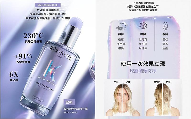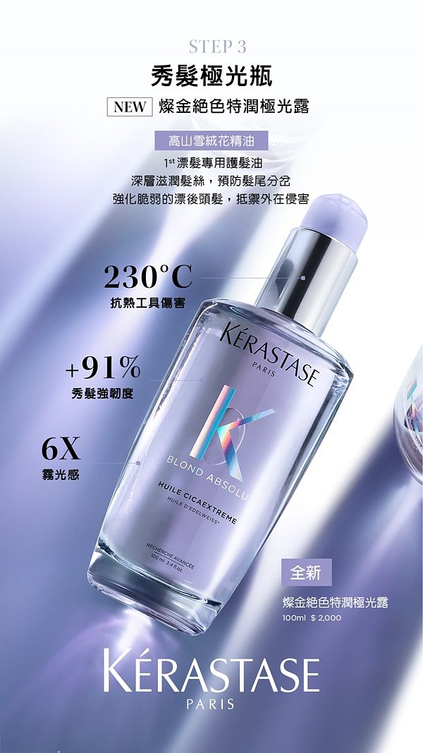 KÉRASTASE巴黎卡詩「燦金絕色系列」針對不同需求及髮質的漂後髮,從居家保養到沙龍專業課程,提供完整的漂後修護矯色對策: