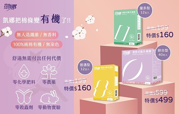 凱娜全品項包括有機衛生棉條、布衛生棉、吸血內褲、月亮杯,為讓台灣女生在月經到來的日子有更多選擇、更舒適的經期體驗,特別推出「凱娜賦權在己禮盒」,一次搜羅各種衛生用品,在最私密自我的日子中,完整且自在的嘗試最適合自己的月經伴侶。