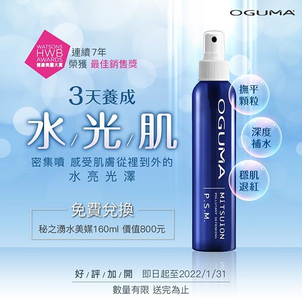 水保養始祖——OGUMA水美媒保濕噴霧,熱銷超過百萬瓶,平均1分鐘就賣出1瓶,更連續七年榮獲屈臣氏最佳銷售獎,國民噴霧的封號名副其實。為了歡慶官網五週年,OGUMA水美媒祭出全民免費兌換價值$800的國民噴霧活動,實體店⾯出⽰證件或透過活動頁註冊都可以做免費兌換。(詳情請洽OGUMA⽔美媒官網)。擁有⾼達150萬會員的OGUMA水美媒不斷地在會員制度上調整及更新,希望讓每個會員甚至尚未加入的消費者,都可以感受到滿滿的用心,OGUMA⽔美媒推出全新會員制度:從2021年12⽉1⽇起消費滿$1,500元,即能夠成為OGUMA水美媒會員,享有168天會員福利!