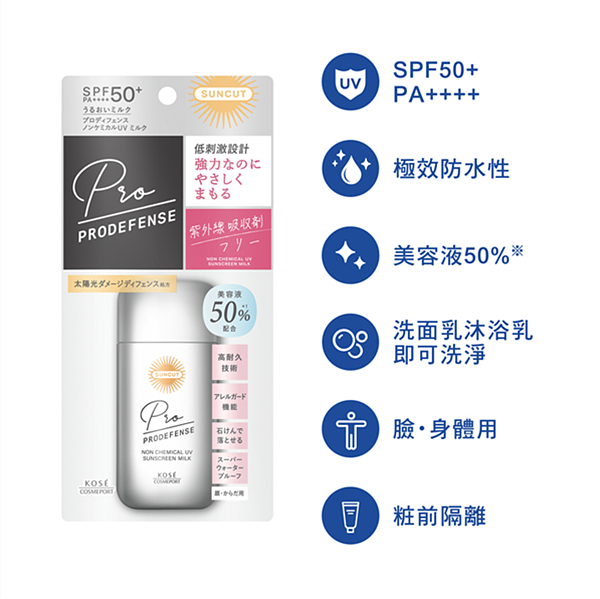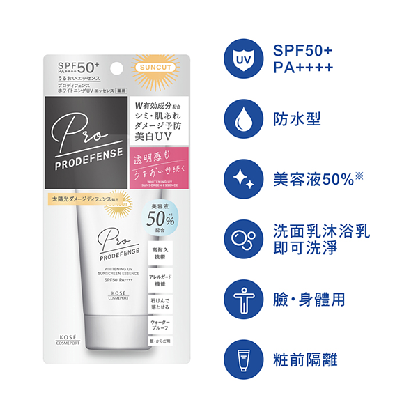新上市的「SUNCUT UV 曬可皙 極度防禦」防曬系列,是針對紫外線對皮膚的傷害以及年齡對策*1而研發的防曬商品,每品皆有添加 50%*2 美容精華及「抵抗太陽光傷害配方」,提供肌膚潤澤,守護受到紫外線傷害的肌膚。自社最高值的防曬係數(SPF50+/PA++++),具有超強抗汗・抗水・耐皮脂的保護膜持續守護肌膚,同時提升肌膚對外在環境傷害的抵抗力。臉與身體皆可使用。使用臉部或身體清潔產品即可卸除。