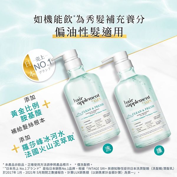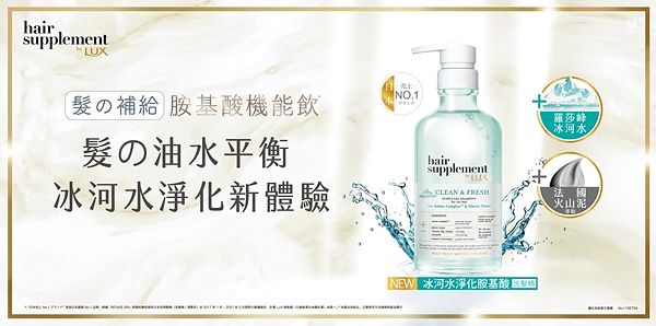 口碑銷售雙冠王的日本「LUX髮の補給機能飲」,2022年全新推出—日本專業團隊為台灣偏油性髮消費者,量身打造的「LUX冰河水胺基酸洗護系列」,以冰河水為主成分,有效清潔頭皮,帶走髒污及多餘油脂,同時搭配保濕成分,讓頭皮與秀髮重回健康的油水平衡狀態。