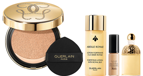 組合內容:24K純金絲光氣墊粉餅01N(正品)/皇家蜂王乳蜜露 40ml/24K純金光粉底液 5ml/花草水語 陽光甜橘淡香水7.5ml。(註:各百貨通路、法國嬌蘭台灣官方線上旗艦店優惠組合略有不同,以各通路公告為準)