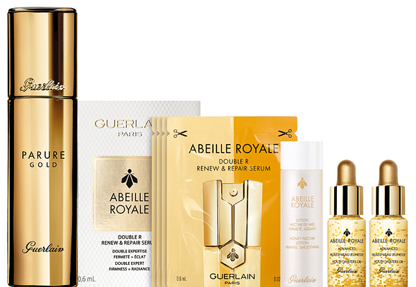 組合內容:皇家蜂王乳黃金冰滴眼萃20ml(正品)/皇家蜂王乳蜜露 15ml/皇家蜂王乳雙導精華體驗禮(輕巧盒裝版)/皇家蜂王乳平衡油3G 5ml/皇家蜂王乳蜂蜜修護霜 7 ml/皇家蜂王乳修護晚霜 5 ml。(註:各百貨通路、法國嬌蘭台灣官方線上旗艦店優惠組合略有不同,以各通路公告為準)