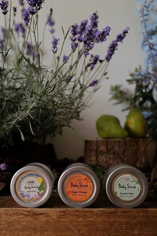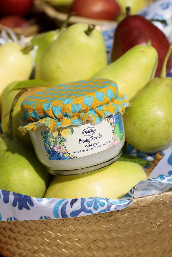 SABON最受歡迎的兩款果香身體磨砂膏:香蘋薰衣草、西西里柑橘,加上繽紛野梨限量香氣。身體磨砂膏中富含死海鹽、4 種天然植物油和維生素 E,可溫和去除角質,使肌膚有煥然一新的柔滑觸感。