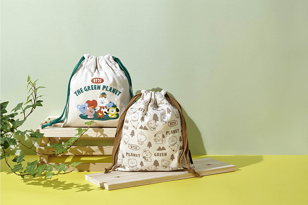 ● 哩哩叩叩好好袋 — 兩款不同風格的BT21 The green planet印花束口袋,讓你帶著抗痘三寶或其他隨身小物一起上山下海,走遍世界。哩哩叩叩小物,怎麼帶都好好袋。(屈臣氏限定)