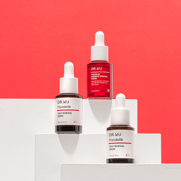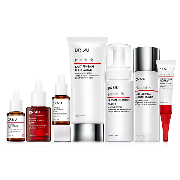 為了幫所有膚質解決八大瑕疵問題,2022年DR.WU將原有杏仁酸煥膚精華從2款擴充成3款:針對易泛紅的敏弱肌和煥膚新手推出全新的「杏仁酸溫和煥膚精華6%」;針對混合、油性膚質及進階煥膚的經典產品「杏仁酸亮白煥膚精華18%」,也推出限量紅瓶新包裝;至於「杏仁酸溫和煥膚精華8%」,則適合一般、乾性、敏感肌膚,以及想以杏仁酸天天進行化學去角質的人群。此外,為增加使用便利性,也首度推出「居家煥膚毛孔緊緻棉片」,雙面設計可濕敷也能作為輔助使用杏仁酸精華的工具,讓煥膚過程更完善。