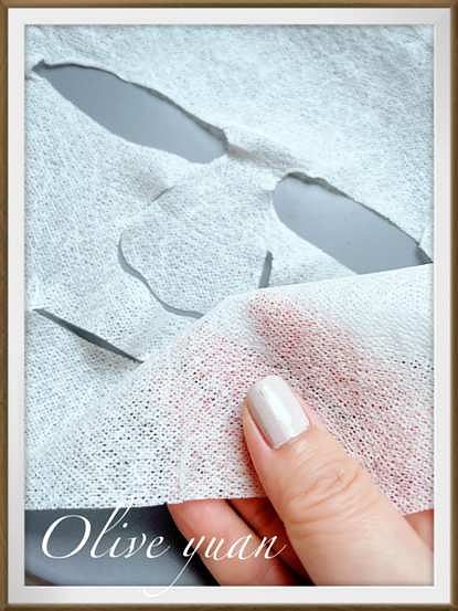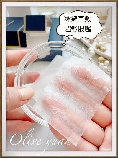我一次會用四片。先放在玻璃小碗中、滴入適量花蜜露(可先用保鮮膜封起來放冷藏),濕敷片吸收力超好,可將花蜜露吸飽飽,不會滴滴落落,接著使用於法令紋及眼下部位,尾端一定要記得拉一下再貼住(超緊超貼),一邊敷一邊“拉拉臉”約5~10分鐘,曬後泛紅時冰敷更舒服。