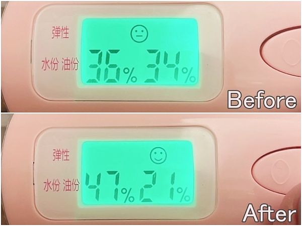 保濕力與彈性測試:直接實測使用在臉上,在未使用前肌膚彈性不佳,水份為36%、油份34%;使用後肌膚彈性提升,水份則提升到47%、油份下降到21%。保水度一口氣提升了11%,油份則降低13%,用後肌膚的保濕感變強,且降低肌膚的油脂問題,堪稱優秀!