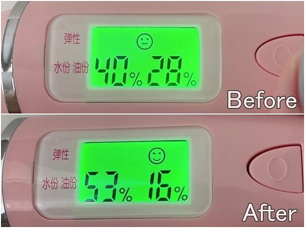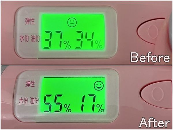 保濕力與彈性測試:直接實測使用在臉上,在未使用前肌膚彈性不佳,水份為40%、油份28%;使用後肌膚彈性被提升,水份則提升到53%、油份下降到16%。保水度提升了13%,油份則降低12%,由實測結果可以看到保濕實力很不錯,油份控制力也很好,若想要找一瓶去角質型化妝水,這瓶就超推!