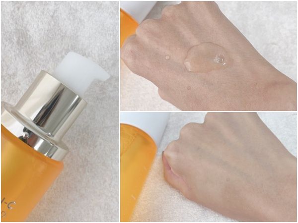 質地感受:質地水感,在塗抹的過程中感覺到它很好被肌膚吸收,且塗擦後感覺肌膚紋理也變得更加細緻,使用時有種肌膚變得更加潔淨的感覺,並有淡淡特殊的金盞花香氣。