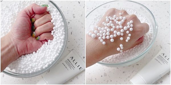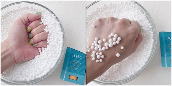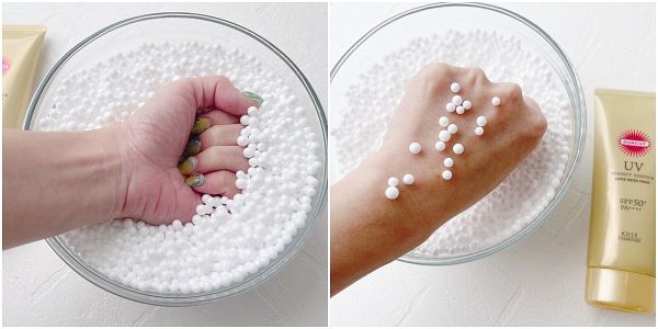 接著要來測試黏膩度,測試方式為在手背上擠出珍珠般大小的防曬品,均勻推開後將手背放入裝滿保麗龍球的碗中用力按壓一下,觀察手背伸出後保麗龍球的黏貼狀態,越多代表越黏膩;越少則代表越清爽!