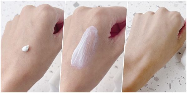為乳狀質地,非常好延展推開,能快速均勻塗抹,且塗抹完有肌膚變得更明亮有光澤,完全不會有泛白感。