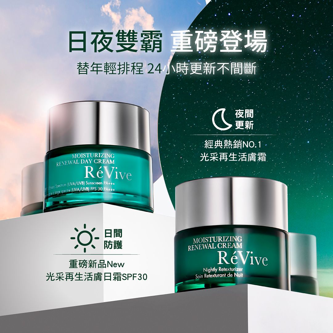 抗老發光權威RéVive迎來25周年,其中蟬聯銷售冠軍、熱銷千萬瓶經典NO.1發光霸主『光采再生活膚霜』,媲美醫美“淨膚+脈衝光”雙機雷射般速效煥膚、奇蹟有感細緻嫩亮,獲得無數網友好評口碑及鐵粉愛用回購,一夜醒來就能感受到肌膚回歸新生緊、嫩、亮!甚至還被喻為 #此生不能沒有的乳霜!夜間煥膚更需要搭配日間防護,防禦紫外線等光老化傷害的同時強化肌膚屏障與抗氧化能力,因此RéVive推出全新『光采再生活膚日霜SPF30』,不僅含品牌獨家抗老核心「Bio-Renewal Technology 肌因再生賦活科技」結合高效煥膚因子「水飛薊素」能做到溫和煥膚且同時抵禦紫外線的傷害,更添加「火山嗜熱菌」及「深海紅藻」可增強肌膚屏障並給予肌膚日間所需的保濕滋潤!使用『日夜霜霸』早晚密集煥膚保養,可快速突破保養停滯期,養出自己的膚況巔峰!另外RéVive也推出專為敏弱肌設計的輕盈版活膚霜『光采再生活膚乳液』使用兩種果酸溫和煥膚,低油、無香料、無香精配方更是成為了夜間輕保養的新選擇!