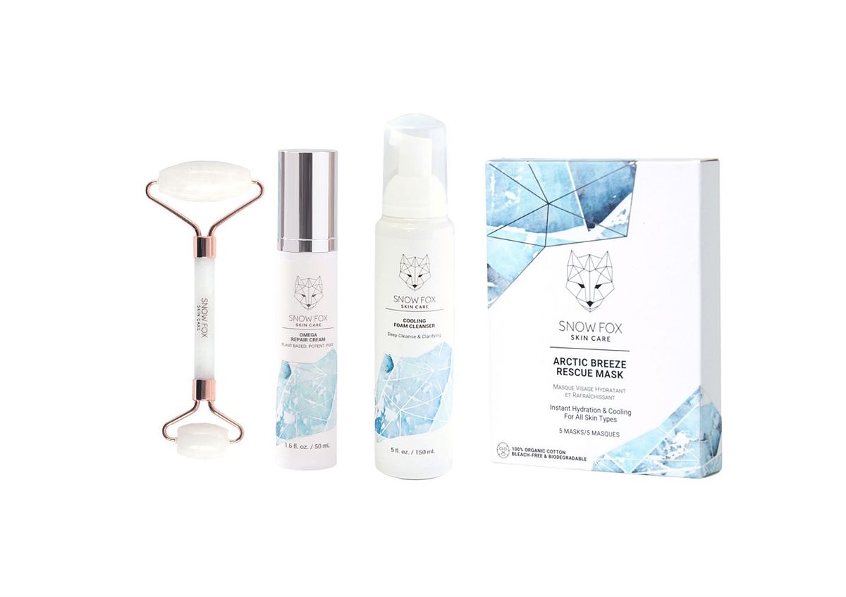 Snow Fox的冠軍商品組合,從洗臉開始喚醒肌膚活力,有機薄荷成分協助穩定肌膚狀態,使用涼感修護面膜搭配贈送的白玉美妝按摩棒,提升面膜精華吸收效能,最後使用Omega修護面霜進行肌膚鎖水,強化肌膚屏障。