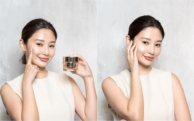 1. 以小指指腹沾取適量《年輕無敵膠原霜》,在雙手手指間輕輕搓揉,以膚溫啟動保養成分。