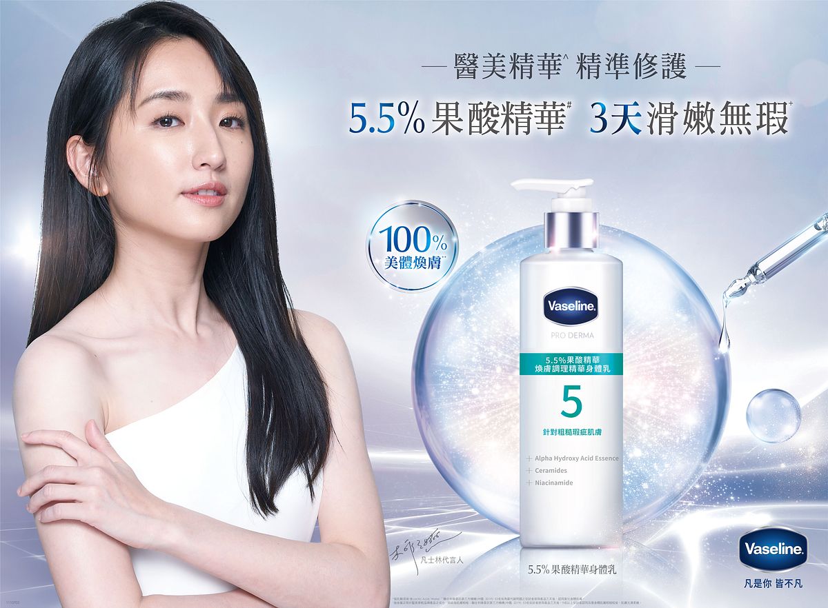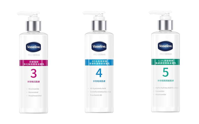 凡士林擁有超過150年肌膚保養經驗-致力於解決與擊退各種肌膚問題。凡士林升級保養概念,推出全新「PRO DERMA全能精華身體乳」,全系列注入醫美精華^與益生元修護精華*。三款全能精華身體乳:菸鹼醯胺淨光無瑕精華身體乳、4D全能玻尿酸 浸潤修護精華身體乳和5.5%果酸精華煥膚調理精華身體乳,因應各種肌膚問題,一抹釋放超強肌膚修護力,迎接更細緻無瑕的肌膚。
