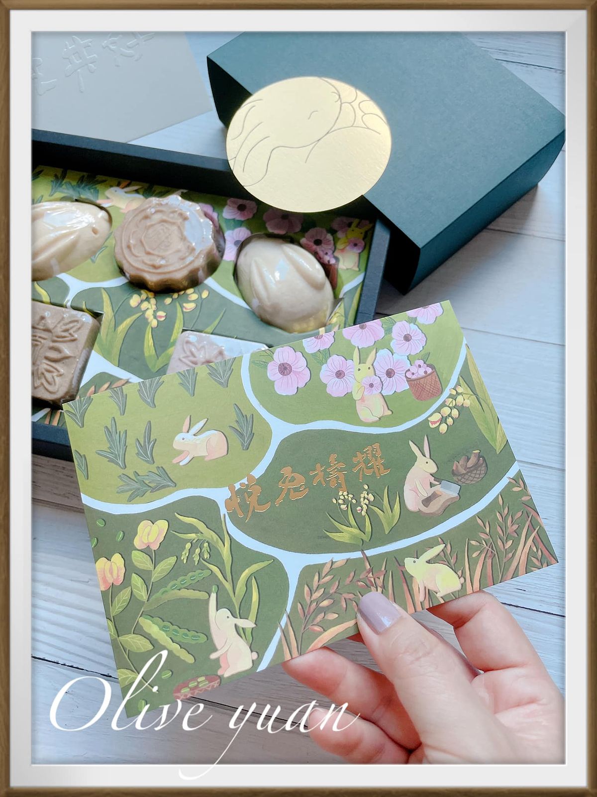 接著,禮盒中的說明卡片,兔子在青草藥園中採摘收割的插圖,是設計同仁親手描繪,而「悅兔擣耀」書法字,則是由創辦人—阿原大哥以毛筆親自書寫,所以這份禮物蘊含了滿滿的祈福療癒深刻意義,還有我手中的那張卡片文字,看了還會讓人熱淚盈眶!