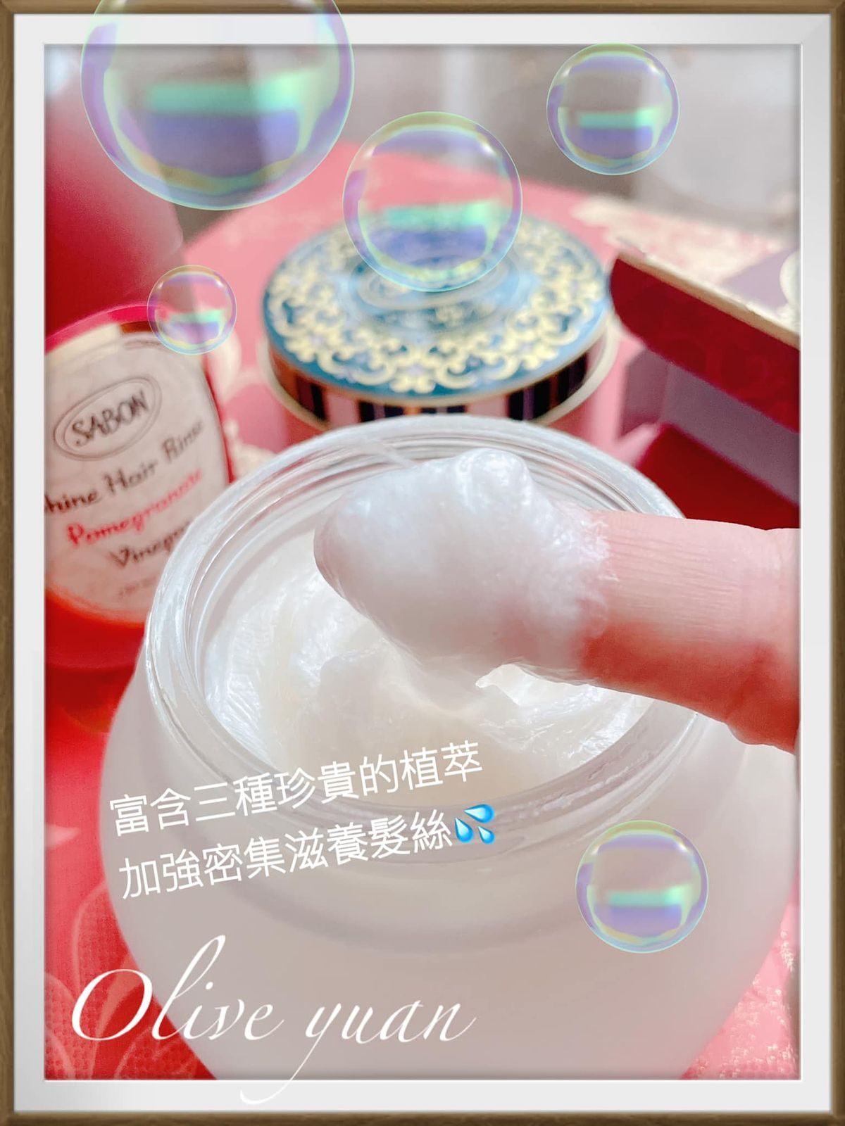 成分含三種珍貴的植萃,更添加乳油木果油,其維生素A、E及高含量脂肪酸,能加強密集滋養髮絲,保護及柔潤秀髮,減少毛躁,賦予健康光澤,深層修護乾燥分岔,保濕滋養,維持髮絲彈性,柔順秀髮。(其實快速瞬間護髮就很有感覺了,但對長髮來說,深層護髮應該很不錯)