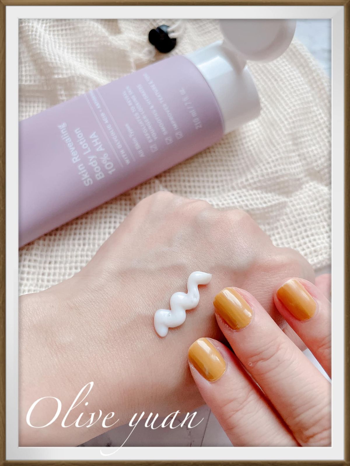 除了10%果酸,還有能提亮膚色的「維他命C」,及深度潤澤肌膚的「乳木果油」,所以質地上感覺它比較潤,像身體乳霜的質地,但一樣非常好吸收,完全無黏膩負擔感。但因為有10%果酸,所以白天要搭配至少SPF30的防曬喔!冬天穿長袖就還OK!