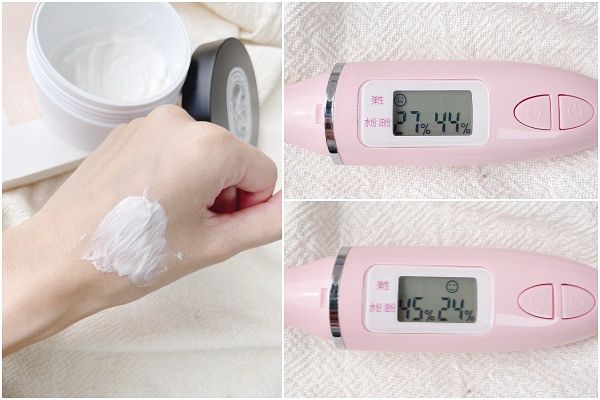 保濕度與彈力度測試 :在未塗擦乳霜前,肌膚彈力極差,水份為27%、油份為44%,肌膚處在非常乾燥的狀態;使用這款diptyque 肌膚之華身體潤澤霜後,水份提升至 45%、油份降低至24%,肌膚彈力度一口氣提升非常多!用後肌膚Q彈細緻。