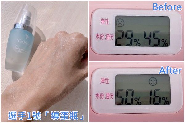 未使用「導蛋瓶」之前,肌膚的水份告急只有29%...彈性也極差都跑出哭哭臉了,使用「導蛋瓶」精華後水份竟然一舉躍升到50%,與未使用精華前相比共提升了21%,肌膚彈性也大幅改善。另外!值得一提的是油份,雖然未在評比內容中,但也從超高的45%,降低到16%,共下降29%,表示這款精華的油水平衡效果超級棒,編輯第一次測時還以為儀器壞掉,實測結果就是這麼驚人!