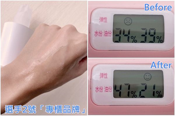 接下來再來看看2號選手知名專櫃精華的實測結果,在未塗擦精華之前,肌膚的水份為34%,彈性也在較差(哭喪臉圖示)的狀態,使用後水份提升到47%,與未使用精華前相比共提升了13%,肌膚彈性度也有所改善,略遜色於1號選手導蛋瓶。