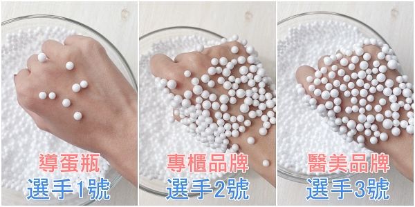 第一名一目瞭然啊!!恭喜選手1號TriForce導蛋瓶,沾取的保麗龍球量最少,可見肌膚清爽度最高,質地也明顯清爽不粘膩!選手2與選手3保麗龍球量明顯較多,兩款質地都偏豐潤,使用完有一層膜在表層的感覺,夏天可能比較不建議使用!