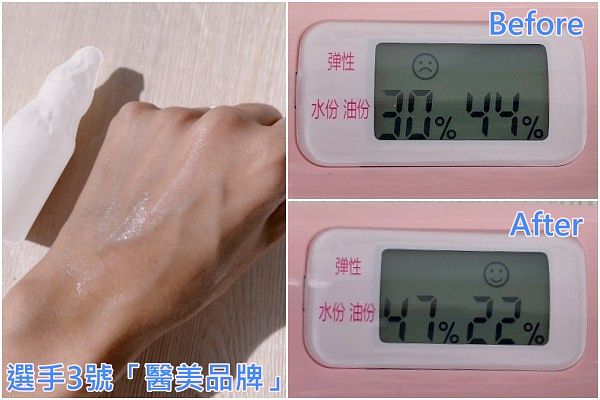 最後看看3號選手的實測結果,肌膚的水份原本為30%,使用後水份提升到47%,與未使用精華前相比共提升了17%,肌膚彈性度也從哭哭變成笑臉。另外油份從44%降低到22%,共下降22%,以精華液的保濕潤澤效果來說,還算不錯。