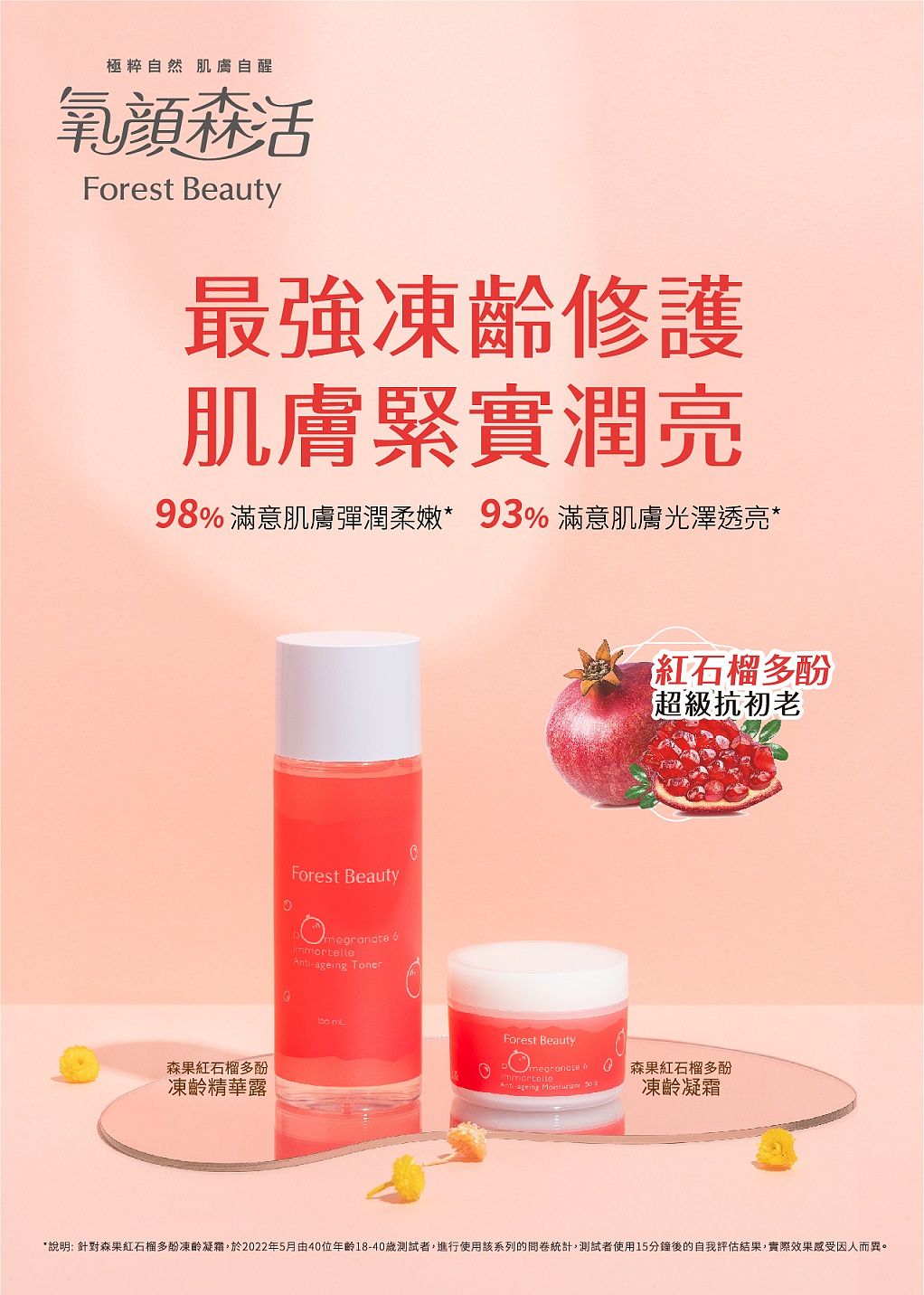 “抗老”這兩字,永遠都是我們最熱烈追求的課題,不僅身體要抗老、連顏值也要隨時在線。除了在飲食方面開始崇尚挑選天然食材,在保養品的選擇上,更偏愛在成份上選擇植粹或植物來源為主。想要時刻保持臉部肌膚緊緻與透亮,又煩惱瓶瓶罐罐太多?其實想要hold住年輕一點都不費力!植粹專家氧顏森活Forest Beauty延續人氣商品【紅石榴多酚凍齡面膜】的好評魅力,2022年全新推出兩款紅石榴保養品「森果紅石榴多酚凍齡精華露」與「森果紅石榴多酚凍齡凝霜」,將有“抗老化紅寶石”美名的紅石榴精華注入其中,堪稱最強凍齡修護,只要簡單兩瓶,就可完成日常保養,讓你肌膚緊緻、彈潤、透亮,由內而外呈現如紅石榴般的紅潤粉嫩肌。