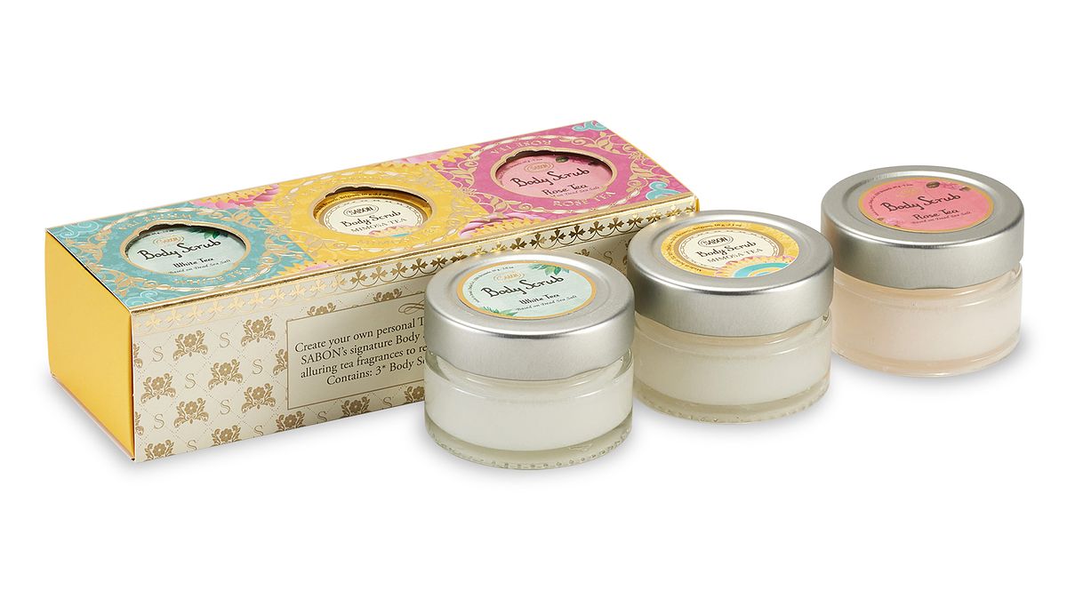 身體磨砂膏禮盒一次收藏SABON三款茶系香氛,在為肌膚磨砂的過程中,悠然享受三段不同的茶語時光:寧靜的白茶、明亮的茗金合歡與優雅的玫瑰茶語,身體磨砂膏中富含死海鹽、4 種天然植物油和維生素 E,可溫和去除角質,使肌膚柔軟滑嫩如獲新生。