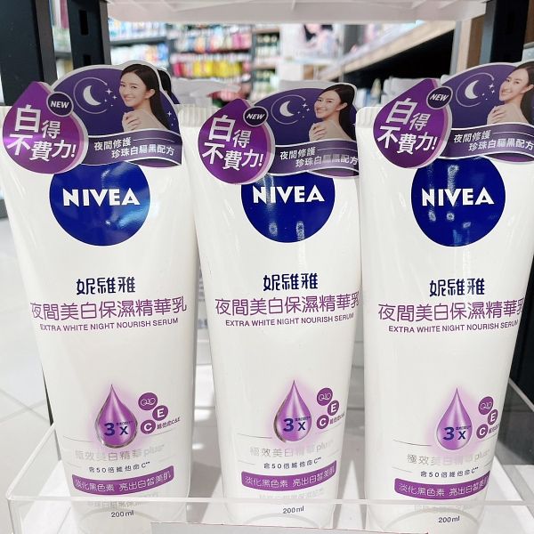 在社群討論度居高不下的妮維雅夜間美白保濕精華乳,超有感的淨白使用效果,以及清透水潤質地,一抹精華質地能迅速被肌膚吸收,留下水嫩觸感不黏膩,超適合台灣氣候使用!使用過後絕對會立即被圈粉~是回購率超高的一款身體乳!