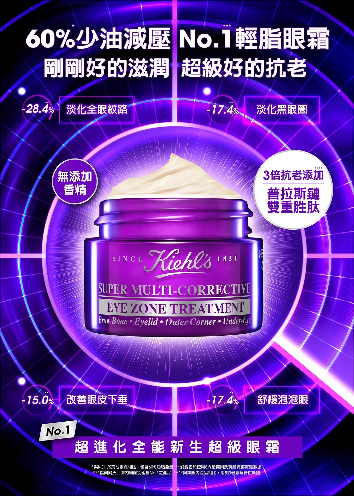 眼周出問題越遮越落漆!充滿紋路的雙眼用再好的遮瑕膏還是逃不過卡粉顯乾紋的危機!早上趕出門辛苦疊上的眼下遮瑕,下午再照鏡子就只剩下一條又一條的乾紋,相信很多人都是被完妝後的眼下乾紋嚇到開始注重眼周保養!被許多保養達人封為命定款的Kiehl’s契爾氏輕脂眼霜「超進化全能新生超級眼霜」,真的圈粉無數,告別眼下遮瑕、拒絕瓶瓶罐罐,只要一瓶就能全方位改善你想得到的眼周問題,眼霜入門選它無懸念!史上最輕盈的"60%少油配方",使用起來柔滑清爽無負擔,直接給過,不多不少提供剛剛好的潤澤直接給肌膚100分的抗老!難怪一年四季都少不了它,換季乾燥、出國旅行都要帶著這款護眼神霜才安心!把化妝台上的遮瑕膏換成Kiehl’s契爾氏輕脂眼霜,就是眼周肌膚年輕的開始!