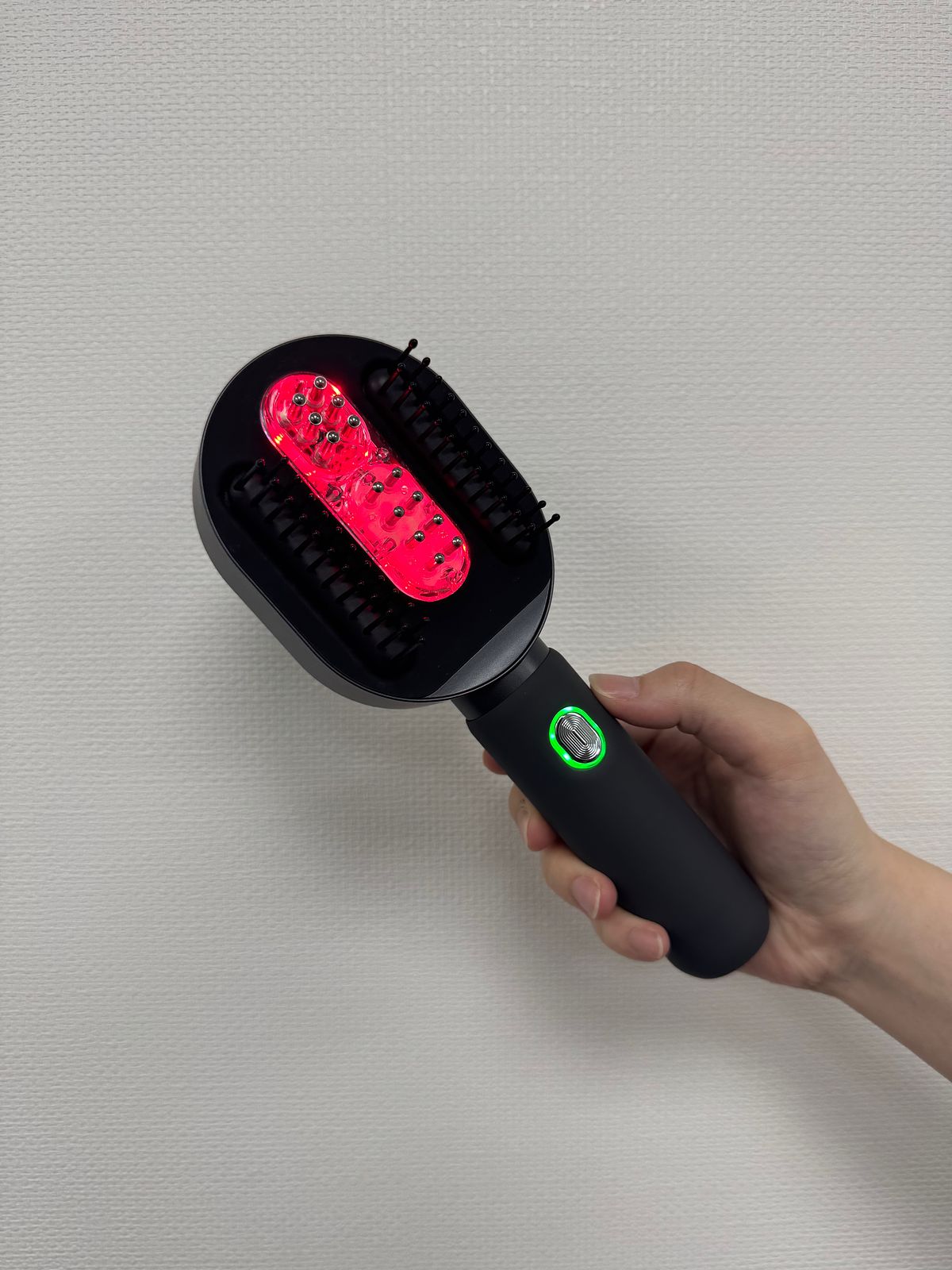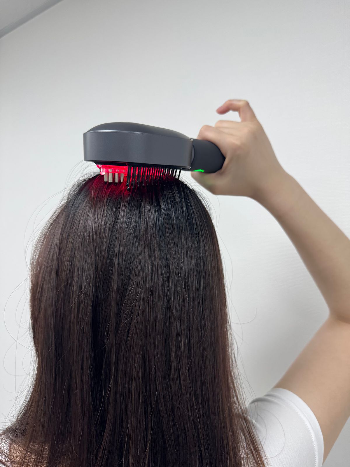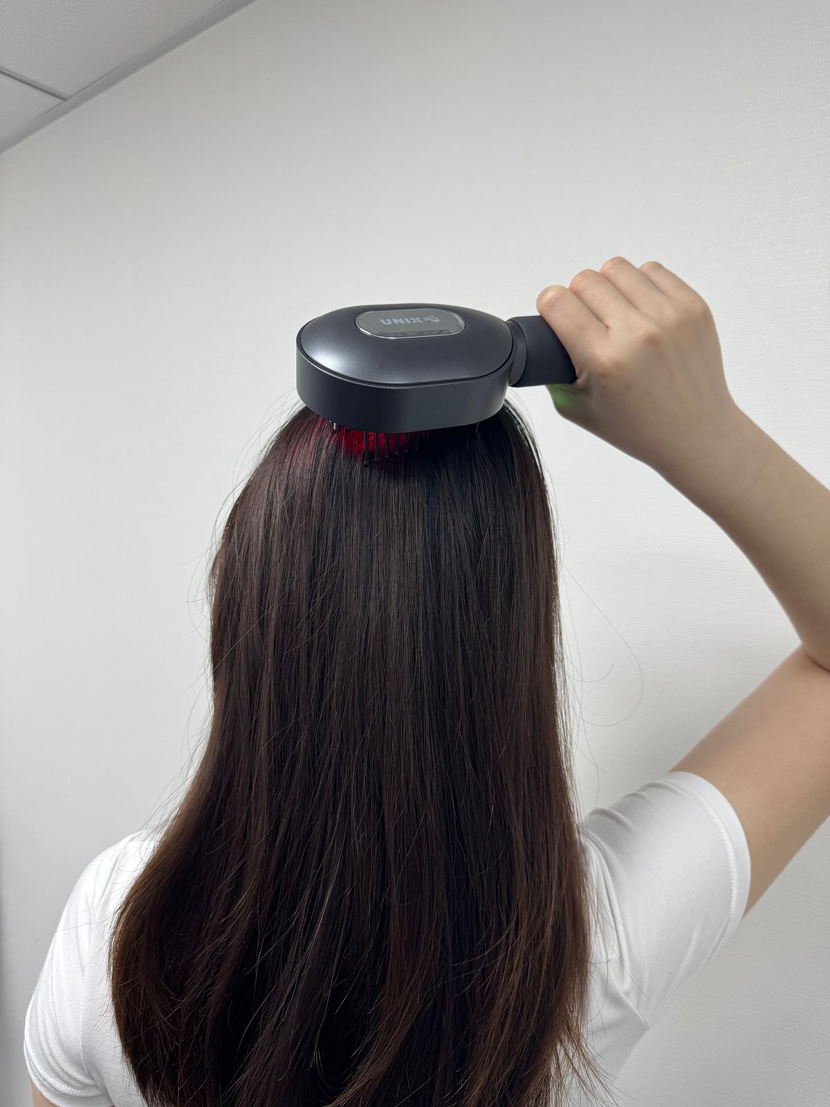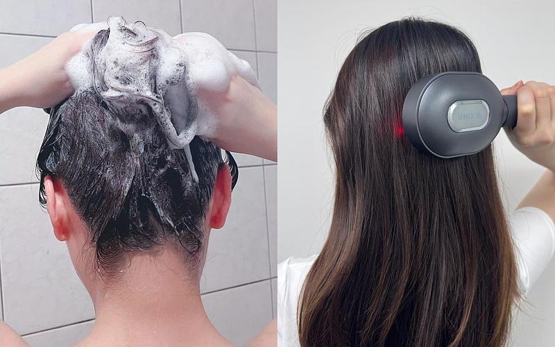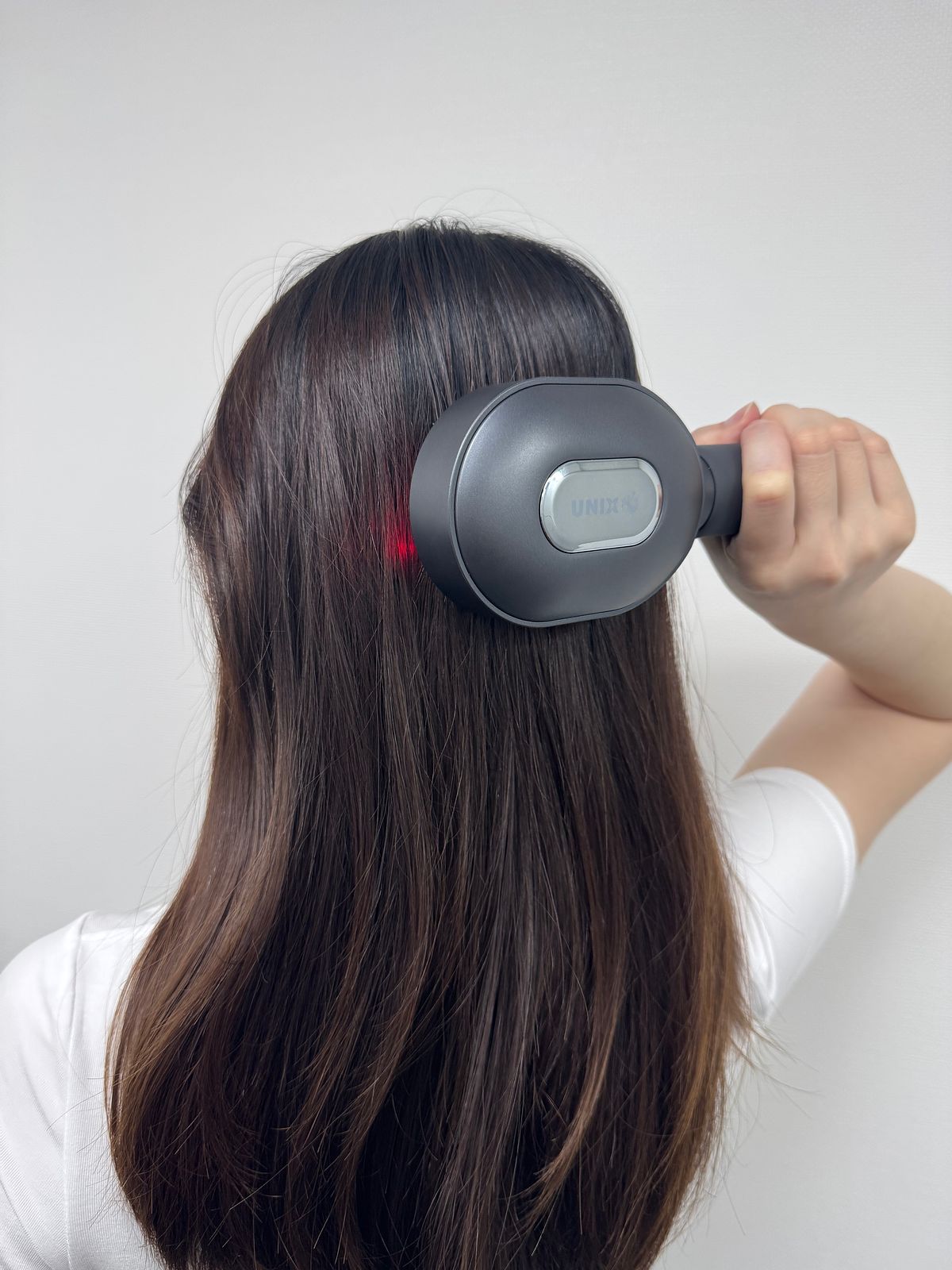 最後一步可是養出健康頭皮和一頭豐盈秀髮的秘技!編輯使用了近期話題度很高的居家養髮神器 UNIX HAIR 光感律動按摩梳做頭皮按摩, 這支光感律動按摩梳利用低頻電流幫頭皮進行小運動,讓休眠的髮根被喚醒,並以 650nm 波長的紅光為頭皮注入能量。搭配特製律動齒梳,就像有人幫你進行頭部按摩,力道恰到好處,能刺激頭部多個穴位,讓平時緊繃的頭皮得以放鬆!不只如此,UNIX HAIR 光感律動按摩梳還有特製精華儲液倉,可以自由加入各種品牌的養髮液、頭皮精華,梳頭時一邊按摩一邊讓保養品都吸收進頭皮。持續使用一段時間會發現,頭髮豐盈超有感,而且每次洗完頭用 UNIX HAIR 光感律動按摩梳按摩頭皮時,都能獲得一段療癒時光。