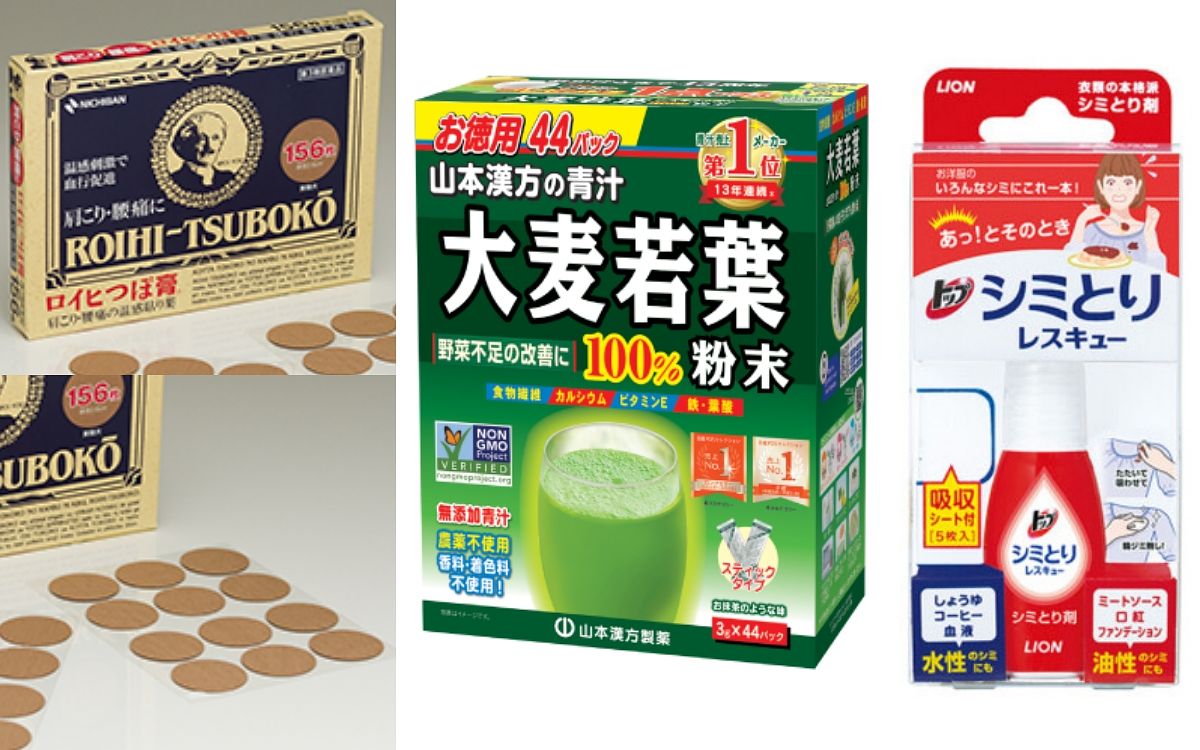 ROIHI-TSUBOKO穴位貼片在日常肩頸背等部位痠痛時,可以針對精準的穴點貼上,感覺起來十分沁涼舒適!山本漢方大麥若葉青汁標榜式具有抹茶風味與天然香氣的美味青汁,適合每日飲用保健,最後LION衣物去漬急救隨身瓶只要一瓶可同時對應水性、油性的汙漬做緊急的處理,包包裡可以儲備一罐,不怕外出或吃飯會弄髒衣物。