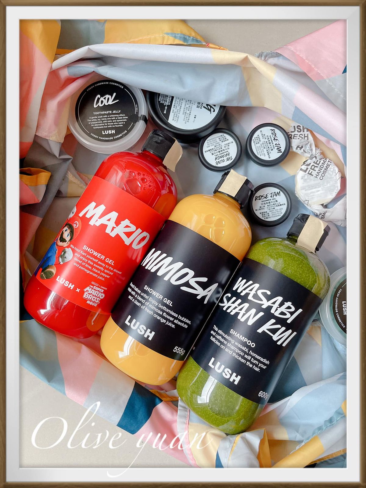 除了「漱口粒」跟「潔齒果凍」,我其實還買了其他東西(說好的“不買”呢)!製作人好友說“好像紅綠燈”,叫我一定要拍照!而且回來試用後的香味也好棒!其中有快賣完的期間限定「瑪利歐沐浴露」(另外還有綠色的路易吉沐浴露喔),期間限定「含羞草沐浴露」,還有明星商品「山葵洗髮露」。