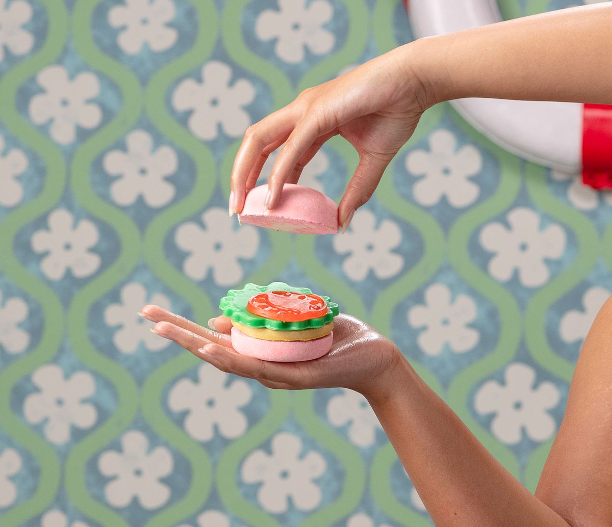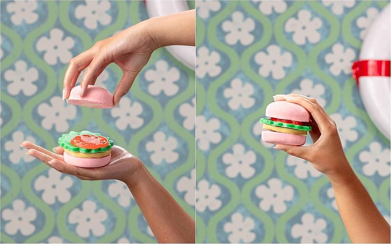 靈感源自蟹堡王招牌蟹堡的三合一的浸浴組合,能令你的沐浴體驗更臻難忘!招牌蟹堡中包含兩塊果香馥郁的漢堡包汽泡彈,瀰漫著精油和青檸精油的香氣。漢堡包汽泡彈則夾著純素漢堡排泡泡浴芭,洋溢著濃郁活力四射的布枯葉精油與西西里檸檬精油的香氣。最後,別忘記你的蟹堡配料-生菜及番茄香氛皂!兩款香氛皂也帶著清爽的西瓜香味。這款美味蟹堡造型的沐浴組合將以可完全回收的盒子包裝!