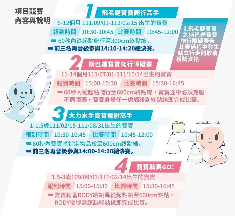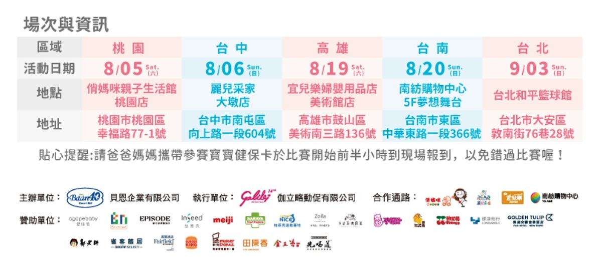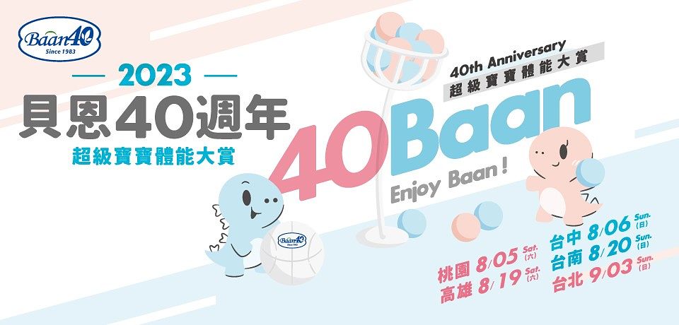 「貝恩40週年超級寶寶體能大賞」包含全台(桃園/台中/高雄/台南)寶寶競賽預賽外,更將於9月3日 (星期日) 於台北和平籃球館舉辦台北預賽及總決賽。主場活動當日現場亦有親子市集、美食、闖關遊戲和衛教專區,豐富的活動讓爸爸媽媽帶著寶寶共度美好的時光,一同來遊玩,一起陪寶寶長大,留下美好的回憶。